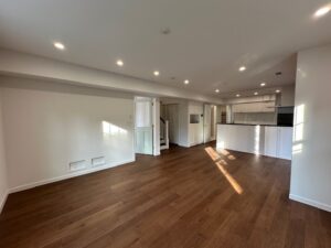 濃い目の床材に ドライウォールで仕上げたリビングです。